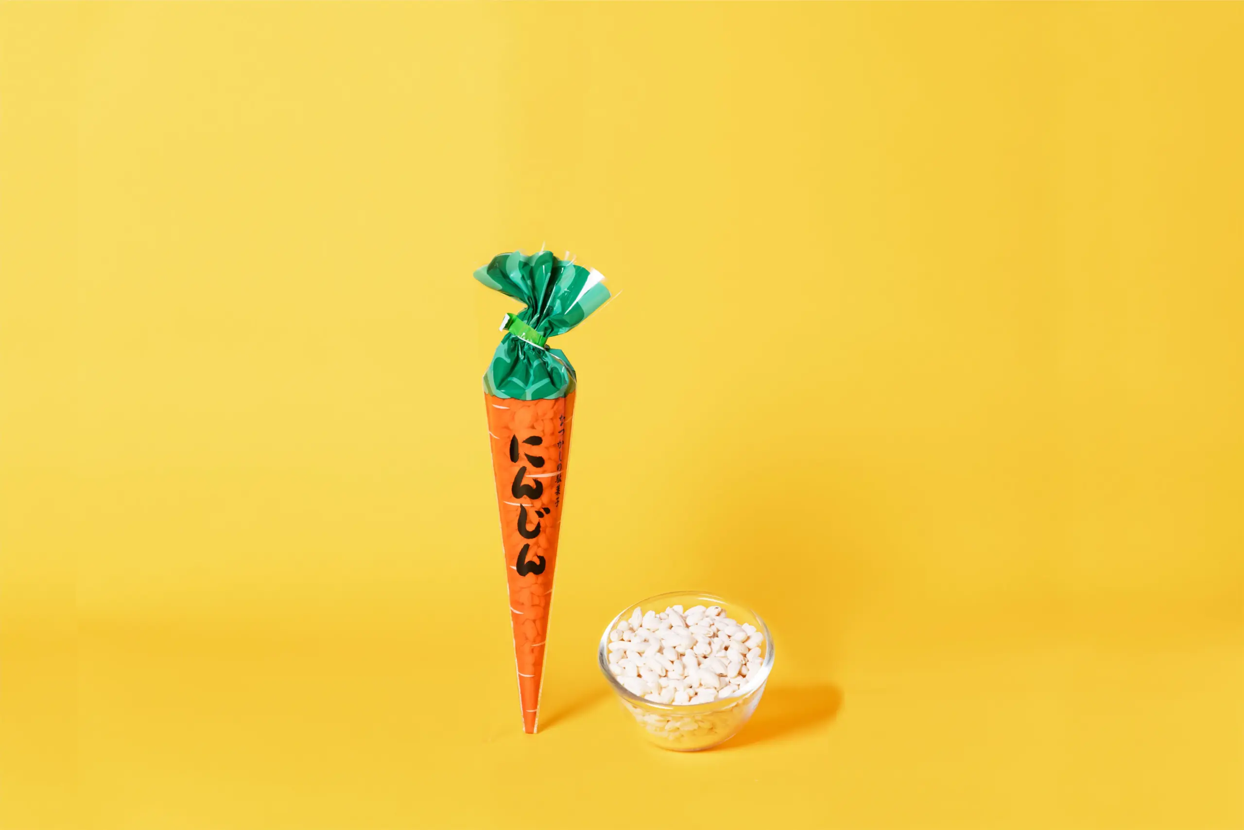 日本への伝来は1950年代とされ、戦後すぐの頃から、ポン菓子「にんじん」として販売されていました。最初は三角形の白い袋に入れて「だいこん」と名付けられましたが、地味すぎる為、三角形のオレンジ色セロファンに変更されました。当時、子供たちが苦手な「にんじん」を意識的に選んで命名されています。この名前には、子供たちが「にんじん」を好きになることを願っています。